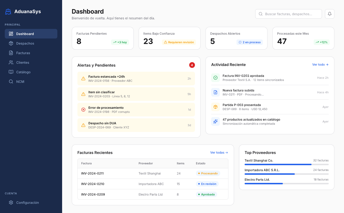 Aduana Easy usa IA para extraer, clasificar y aprender de cada factura que procesás. Tu operación aduanera, simplificada.